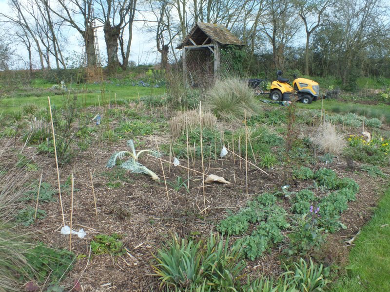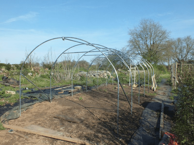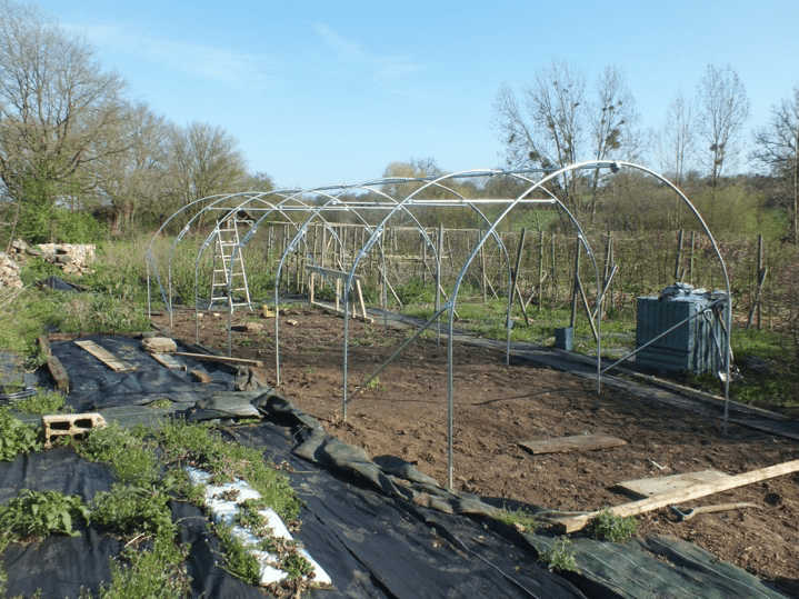 The wet cold winter had one advantage for us. The weeds were as badly affected as everything else in the garden and so there wasn’t quite so much work to do as usual when we got back here at Easter. However, the lake was overflowing badly and so there has been a lot of erosion of the earth behind the dam, and we’ll have to do some serious repair work as soon as the water level drops. And edward’s first jetty was completely wrecked, with bits of washed right over the dam. The big excitement has been the new polytunnel even though it took slightly longer than the 6 hours they suggested it needed to put up! Despite Edward’s amazing DIY skills it took about 4 days.